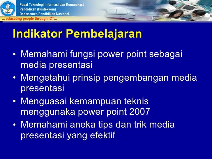 - 2. Indikator Pembelajaran <ul><li>Memahami fungsi power point sebagai media presentasi </li></ul><ul><li>Mengetahui prinsip pengembangan media presentasi </li></ul><ul><li>Menguasai kemampuan teknis menggunaka power point 2007 </li></ul><ul><li>Memahami aneka tips dan trik media presentasi yang efektif </li></ul>