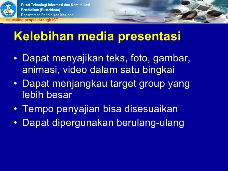 - 3. Kelebihan media presentasi <ul><li>Dapat menyajikan teks, foto, gambar, animasi, video dalam satu bingkai </li></ul><ul><li>Dapat menjangkau target group yang lebih besar </li></ul><ul><li>Tempo penyajian bisa disesuaikan </li></ul><ul><li>Dapat dipergunakan berulang-ulang </li></ul>