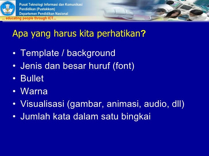 - 36. Apa yang harus kita perhatikan ? <ul><li>Template / background </li></ul><ul><li>Jenis dan besar huruf (font) </li></ul><ul><li>Bullet </li></ul><ul><li>Warna </li></ul><ul><li>Visualisasi (gambar, animasi, audio, dll) </li></ul><ul><li>Jumlah kata dalam satu bingkai </li></ul>