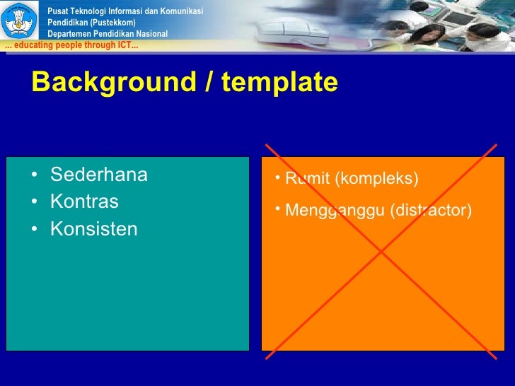- 37. Background / template <ul><li>Sederhana </li></ul><ul><li>Kontras </li></ul><ul><li>Konsisten </li></ul><ul><li>Rumit (kompleks) </li></ul><ul><li>Mengganggu (distractor) </li></ul>