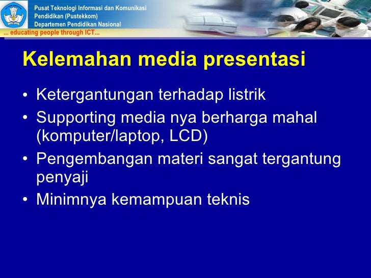 - 4. Kelemahan media presentasi <ul><li>Ketergantungan terhadap listrik </li></ul><ul><li>Supporting media nya berharga mahal (komputer/laptop, LCD) </li></ul><ul><li>Pengembangan materi sangat tergantung penyaji </li></ul><ul><li>Minimnya kemampuan teknis </li></ul>