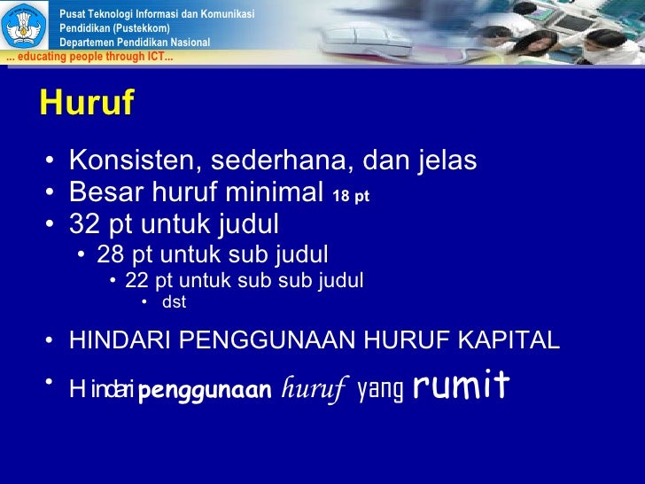 - 40. Huruf <ul><li>Konsisten, sederhana, dan jelas </li></ul><ul><li>Besar huruf minimal 18 pt </li></ul><ul><li>32 pt untuk judul </li></ul><ul><ul><li>28 pt untuk sub judul </li></ul></ul><ul><ul><ul><li>22 pt untuk sub sub judul </li></ul></ul></ul><ul><ul><ul><ul><li>dst </li></ul></ul></ul></ul><ul><li>HINDARI PENGGUNAAN HURUF KAPITAL </li></ul><ul><li>Hindari penggunaan huruf yang rumit </li></ul>