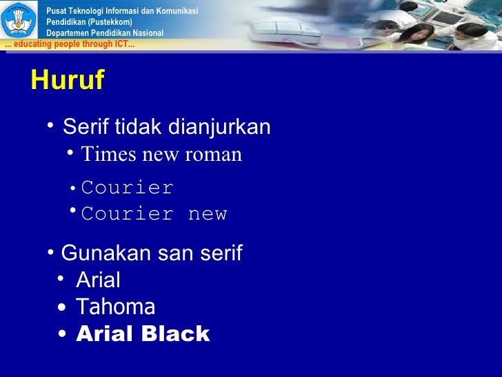 - 41. Huruf <ul><li>Serif tidak dianjurkan </li></ul><ul><ul><li>Times new roman </li></ul></ul><ul><ul><li>Courier </li></ul></ul><ul><ul><li>Courier new </li></ul></ul><ul><li>Gunakan san serif </li></ul><ul><ul><li>Arial </li></ul></ul><ul><ul><li>Tahoma </li></ul></ul><ul><ul><li>Arial Black </li></ul></ul>