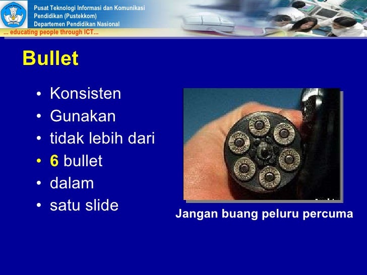 - 43. Bullet <ul><li>Konsisten </li></ul><ul><li>Gunakan </li></ul><ul><li>tidak lebih dari </li></ul><ul><li>6 bullet </li></ul><ul><li>dalam </li></ul><ul><li>satu slide </li></ul>Jangan buang peluru percuma