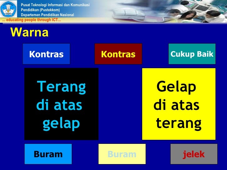 - 44. Warna Terang di atas gelap Gelap di atas terang Kontras Kontras Cukup Baik Buram Buram jelek