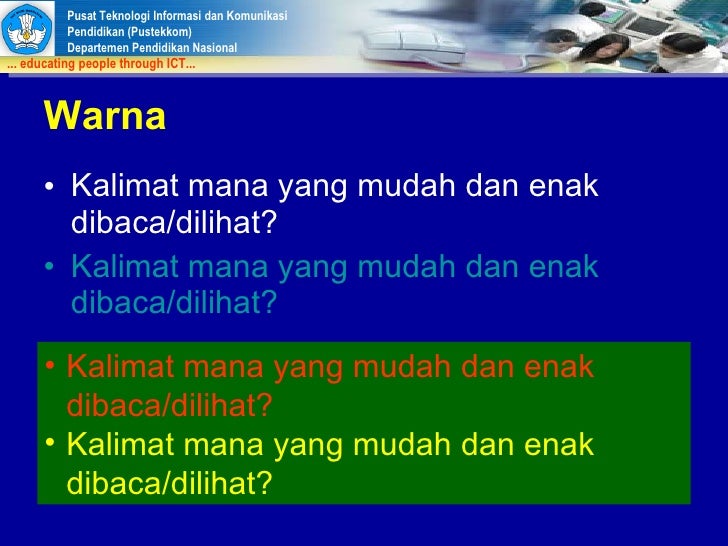 - 46. Warna <ul><li>Kalimat mana yang mudah dan enak dibaca/dilihat? </li></ul><ul><li>Kalimat mana yang mudah dan enak dibaca/dilihat? </li></ul><ul><li>Kalimat mana yang mudah dan enak dibaca/dilihat? </li></ul><ul><li>Kalimat mana yang mudah dan enak dibaca/dilihat? </li></ul>