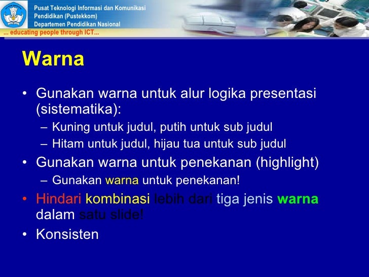 - 47. Warna <ul><li>Gunakan warna untuk alur logika presentasi (sistematika): </li></ul><ul><ul><li>Kuning untuk judul, putih untuk sub judul </li></ul></ul><ul><ul><li>Hitam untuk judul, hijau tua untuk sub judul </li></ul></ul><ul><li>Gunakan warna untuk penekanan (highlight) </li></ul><ul><ul><li>Gunakan warna untuk penekanan! </li></ul></ul><ul><li>Hindari kombinasi lebih dari tiga jenis warna dalam satu slide! </li></ul><ul><li>Konsisten </li></ul>