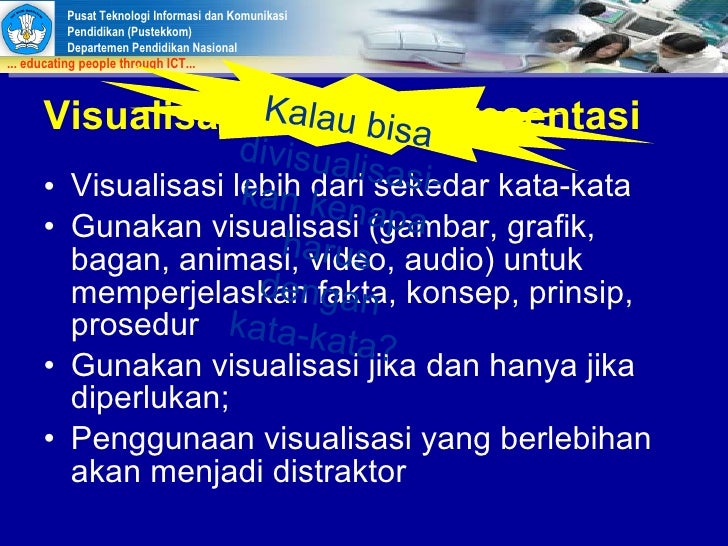 - 48. Visualisasi: Ruhnya Presentasi <ul><li>Visualisasi lebih dari sekedar kata-kata </li></ul><ul><li>Gunakan visualisasi (gambar, grafik, bagan, animasi, video, audio) untuk memperjelaskan fakta, konsep, prinsip, prosedur </li></ul><ul><li>Gunakan visualisasi jika dan hanya jika diperlukan; </li></ul><ul><li>Penggunaan visualisasi yang berlebihan akan menjadi distraktor </li></ul>Kalau bisa divisualisasi- kan kenapa harus dengan kata-kata?