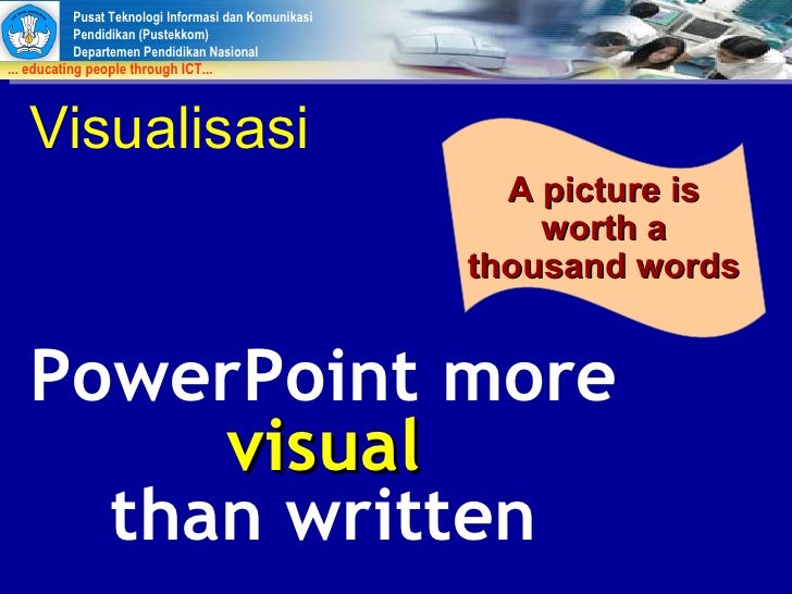 - 49. A picture is worth a thousand words PowerPoint more visual than written Visualisasi