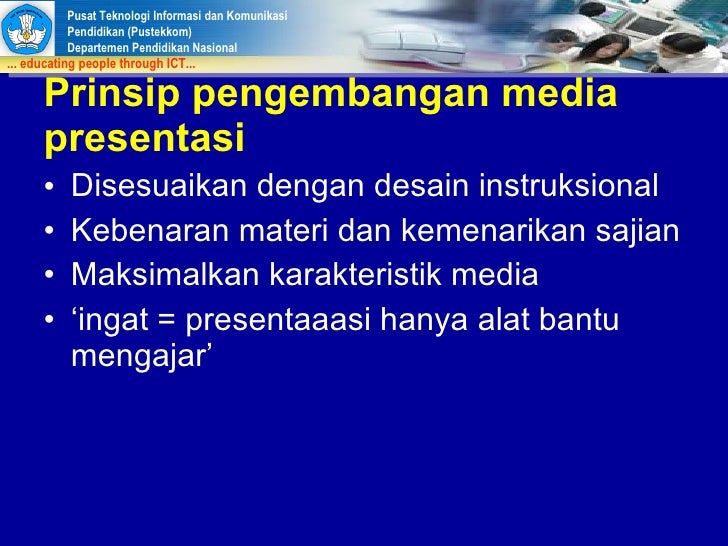 - 5. Prinsip pengembangan media presentasi <ul><li>Disesuaikan dengan desain instruksional </li></ul><ul><li>Kebenaran materi dan kemenarikan sajian </li></ul><ul><li>Maksimalkan karakteristik media </li></ul><ul><li>‘ ingat = presentaaasi hanya alat bantu mengajar’ </li></ul>